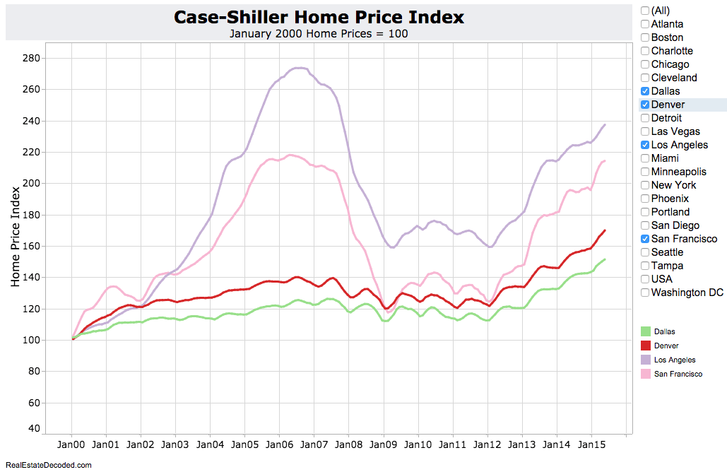 Let’s compare and contrast two hot markets, Denver and Dallas, to two other hot markets, Los Angeles and San Francisco.