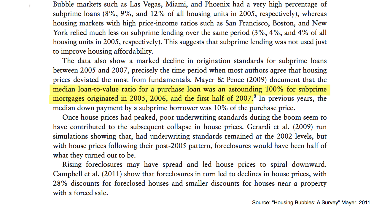 Subprime lending standards fell so far that from 2005 to 2007 the median subprime mortgage had no down payment!
