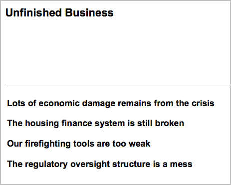 In his section on “Unfinished Business,” Geithner’s second item has this unusually blunt statement, “The housing finance system is still broken.”